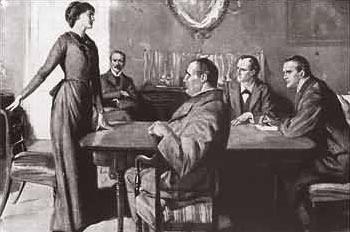 她站了起来。我看到,象刚才一样,她又用轻捷而带有疑问的眼光扫视了我们一下:“你们对我的证词有什么看法呢?”这个问题真象是她已说出来一样。然后,她鞠了一躬,裙边轻扫地面,走出了房间。
